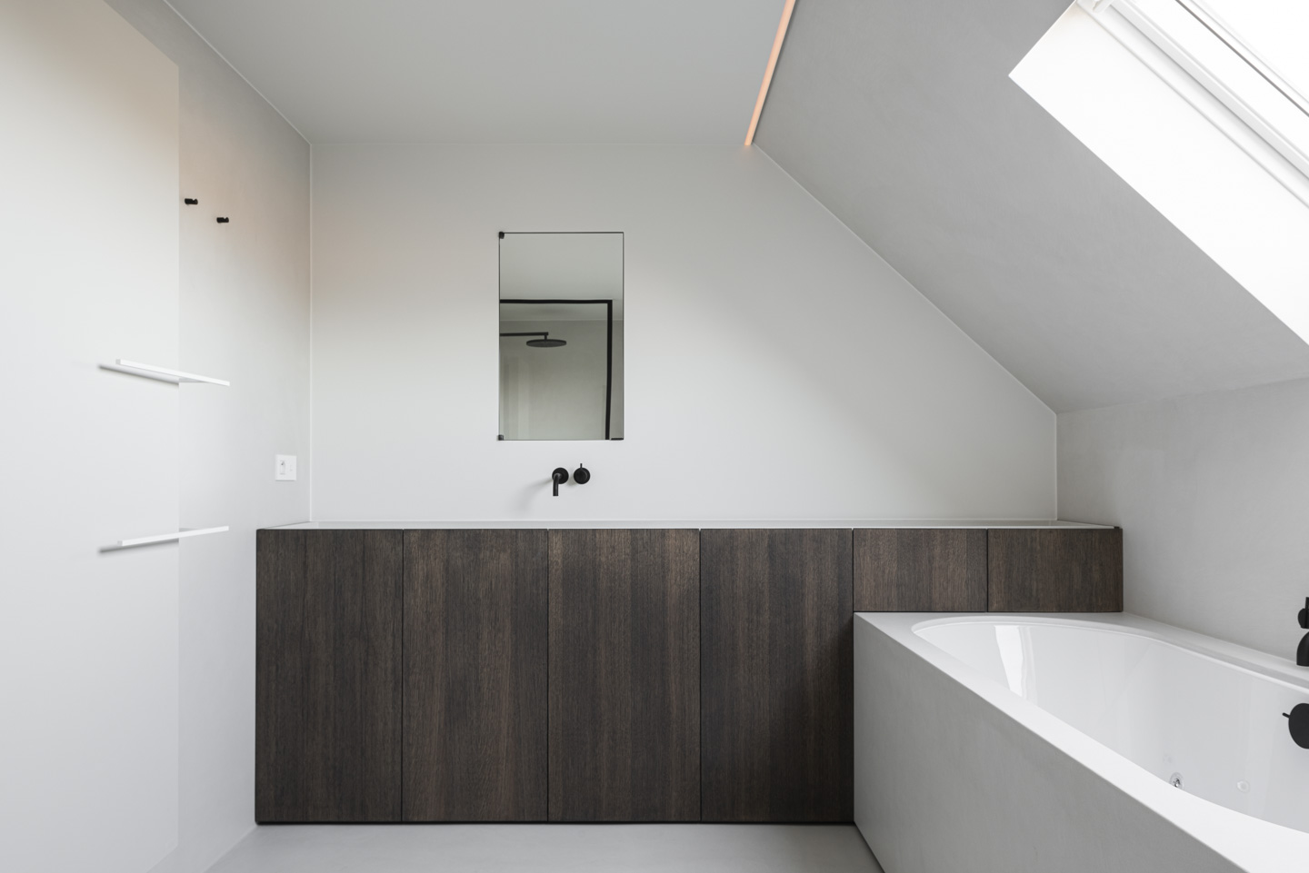 Een high-end badkamer waar we volledig tot rust kunnen komen. Dit was de wens van de bouwheer bij deze badkamerrenovatie. Er werd ingezet op een warm-minimalistisch ontwerp waarbij storende elementen werden weggewerkt en alles naadloos werd uitgevoerd. De focus ligt op de combinatie van een tijdloos ontwerp en vertaalt zich in neutrale, warme en tijdloze materialen.